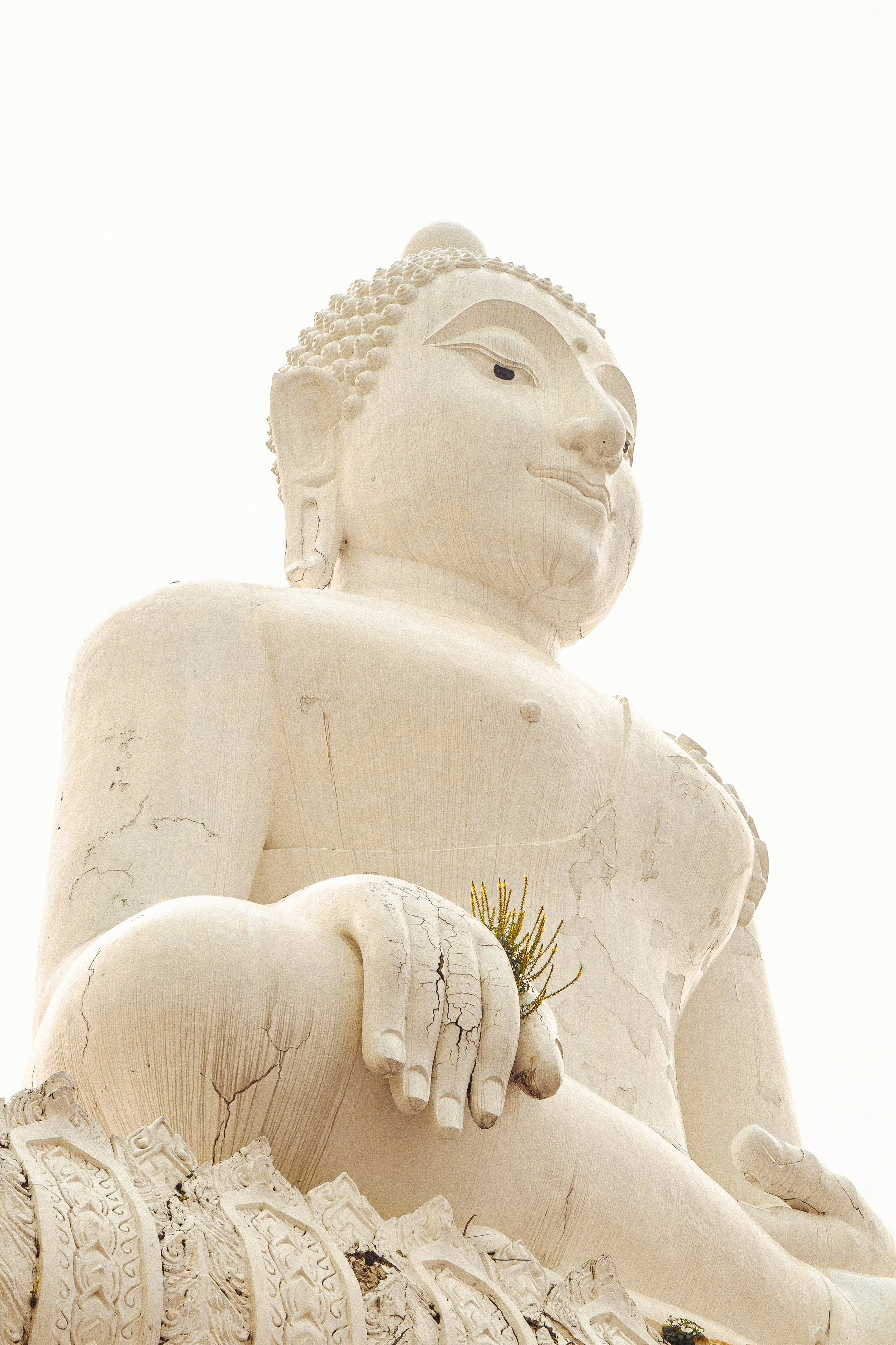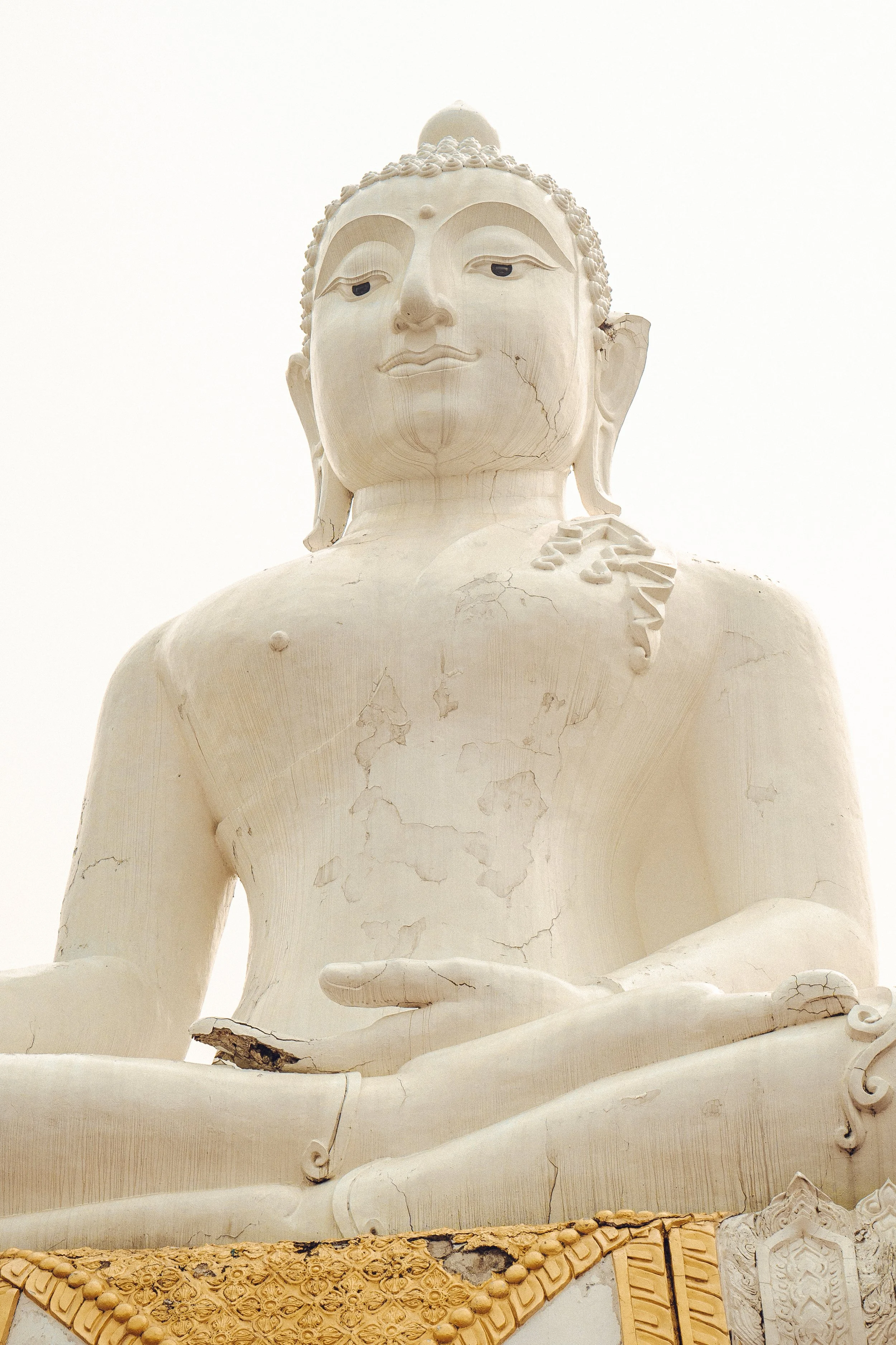 Large white Buddha statue with visible cracks, seated in meditation, and adorned with ornate yellow drapery on the lower section.