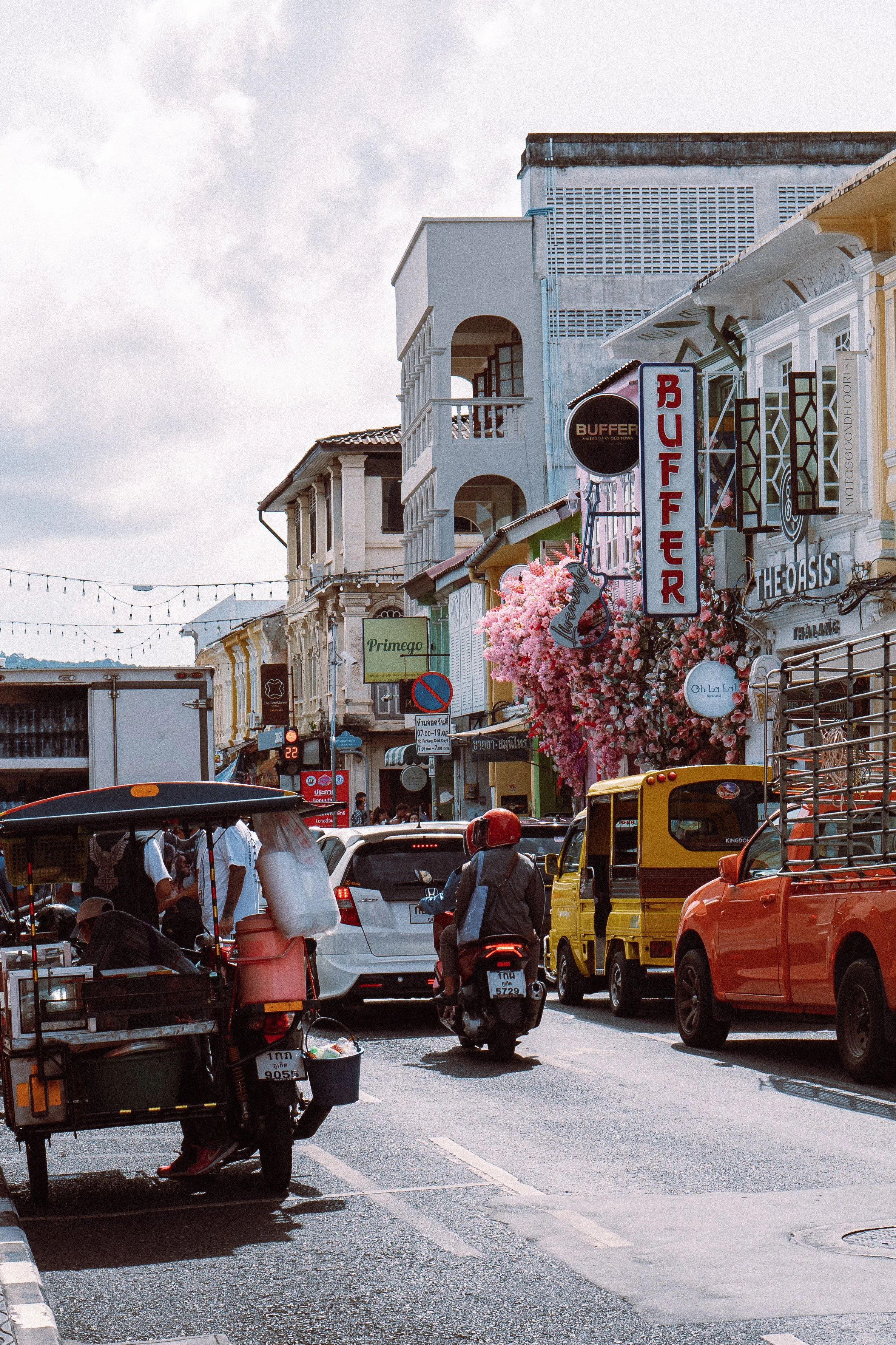 Urban street scene with cars, motorcycles, and vibrant shop signs in a bustling area, featuring colonial-style buildings and decorative flowers.