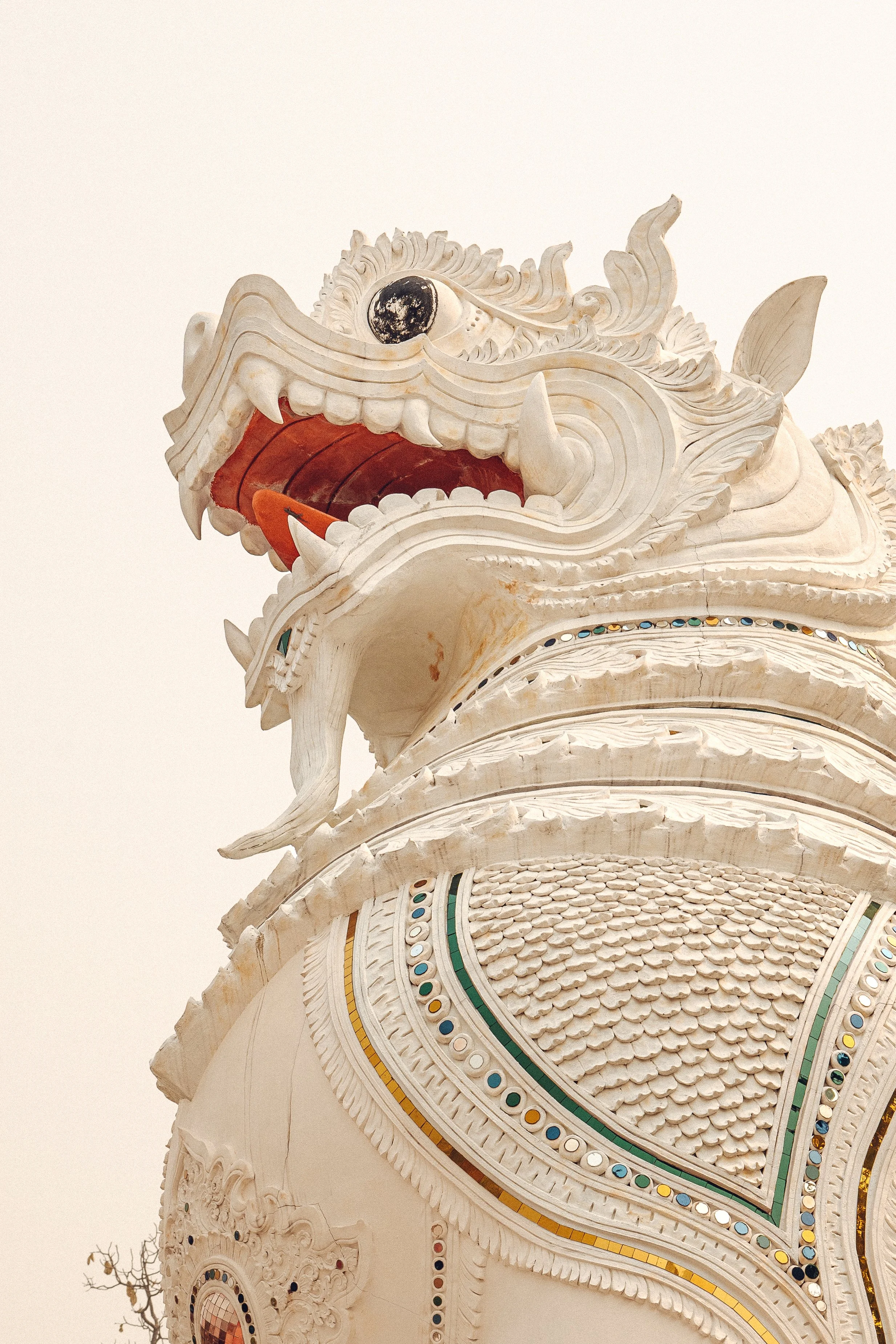Close-up of a white dragon statue with detailed scales and colorful mosaic inlay.